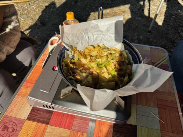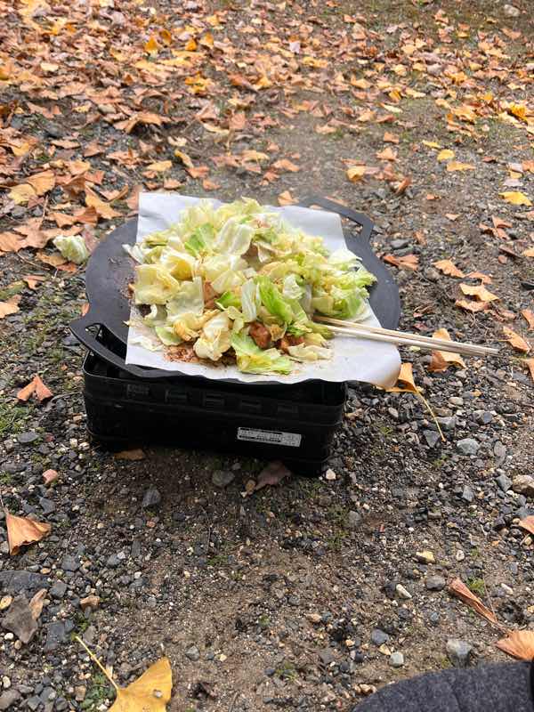 フライパンとキャベツ、そして「ケイちゃん」をジュワッと焼いて、お昼ご飯。