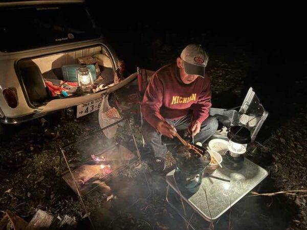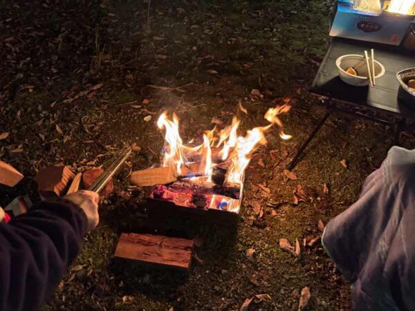 揺れる炎を眺めながら、温かいコーヒーと夜ごはん。