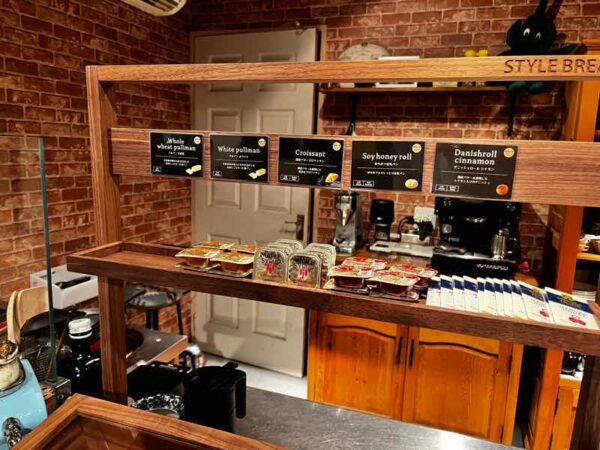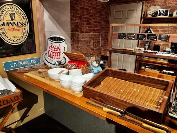英国レシピの手作りソーセージ、ベーコン、美味しいマッシュルーム、焼きトマト、目玉焼き、英国ビーンズ、をプレートをご提案、、、6種類のパン、牛乳、オレンジジュース、紅茶は、ビュッフェスタイル!!