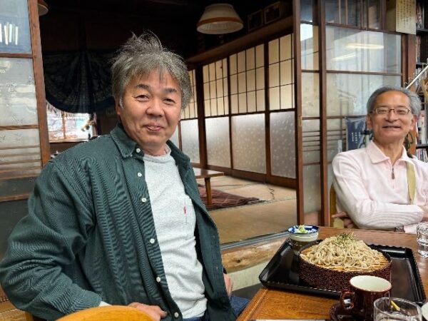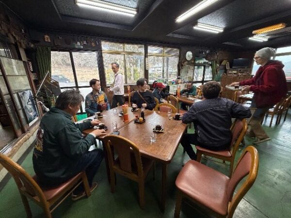 途中の山の真ん中の茶屋さんでコーヒータイムをしたのですが、なぜか小島さんは蕎麦を食べ、、笑