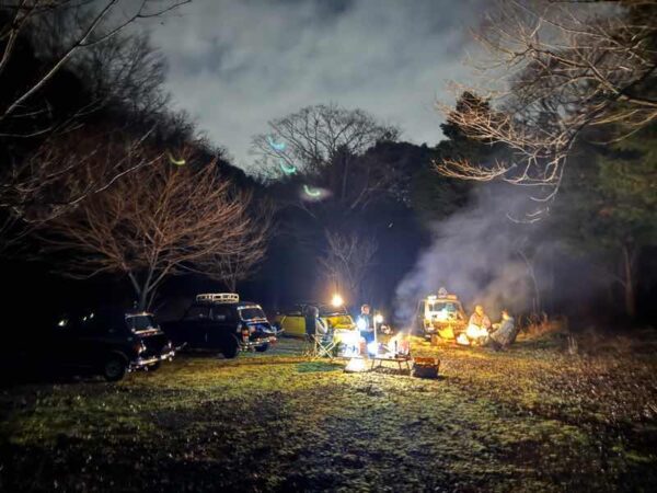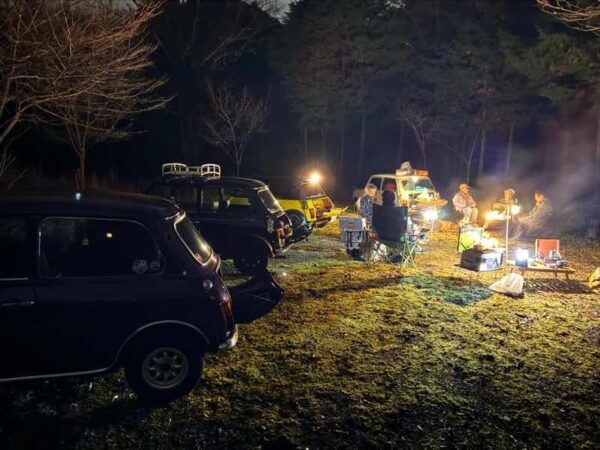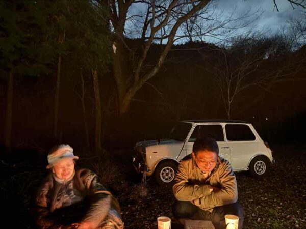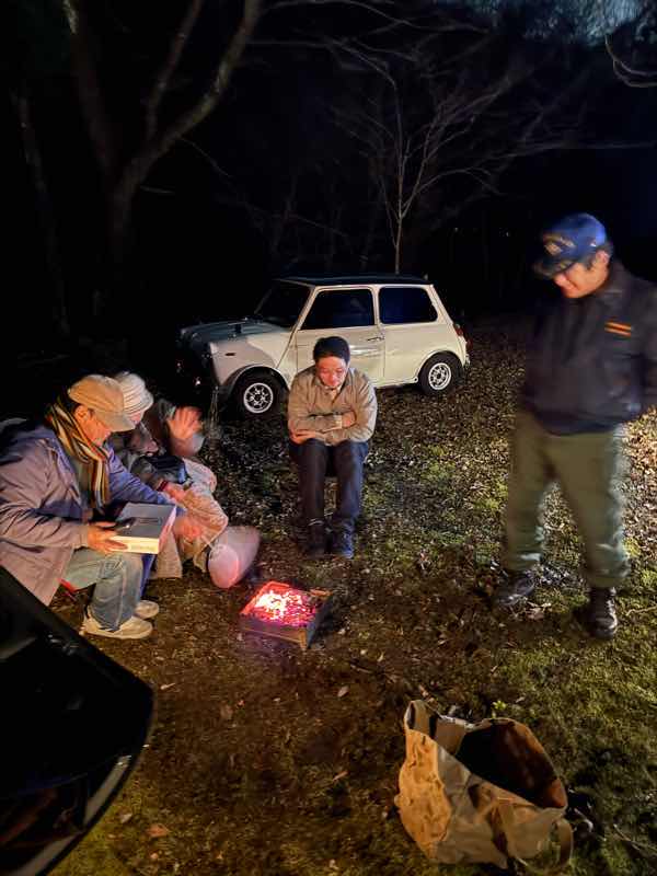 ミニのトランクを開けて、、焚き火の準備とヤカンでお湯を沸かす準備をして、、森の中でディナータイム。