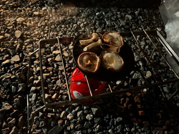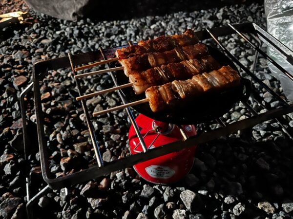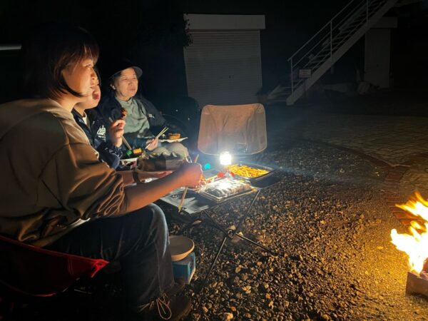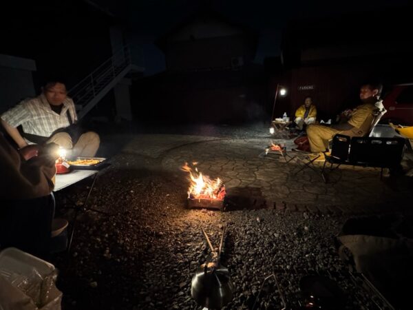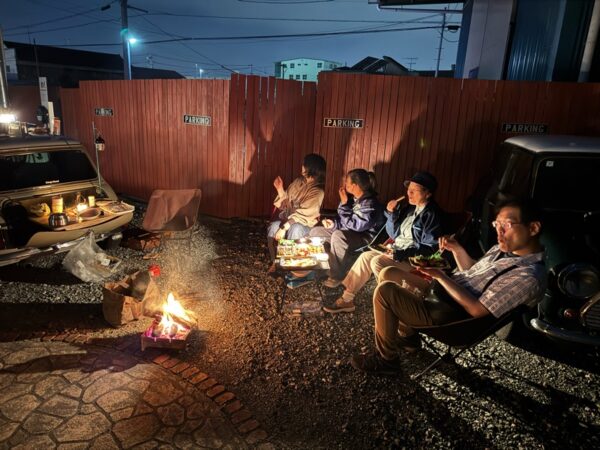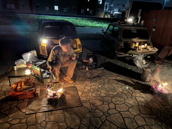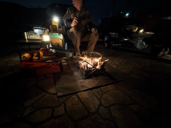 まだまだ風の吹く夜は、肌寒く焚き火が似合う夜でミニのトランクを開けて焚き火にあたりながらの夜ご飯は、格別です!!